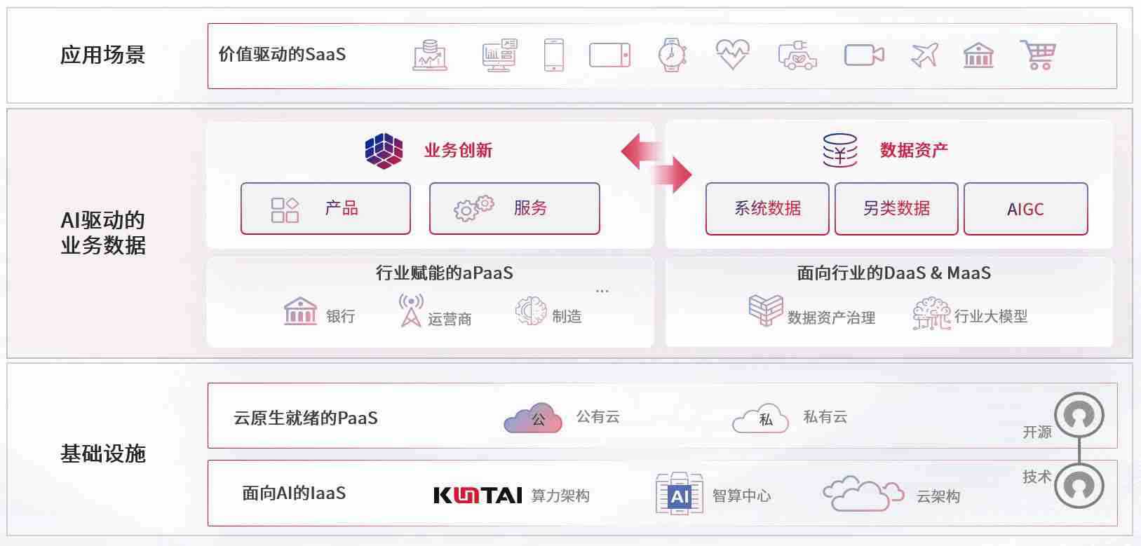数字时代,,,,围绕企业数字化转型的关键要素,,,18LUCK数码开创性的提出数云融合战略和技术体系框架,,,着力在云原生、、、、数字原生、、、AI原生和信创产业上架构产品和服务能力,,,为处在不同数字化转型阶段的快消零售、、、汽车、、、、金融、、、医疗、、、、政企、、、、教育、、运营商等行业客户提供泛在的敏捷IT能力和融合的数据驱动能力,,,构建跨界融合创新的数字业务场景和新业务模式,,助力企业级客户建立面向未来的核心能力和竞争优势,,,,全面推动社会的数字化、、智能化转型升级。。。